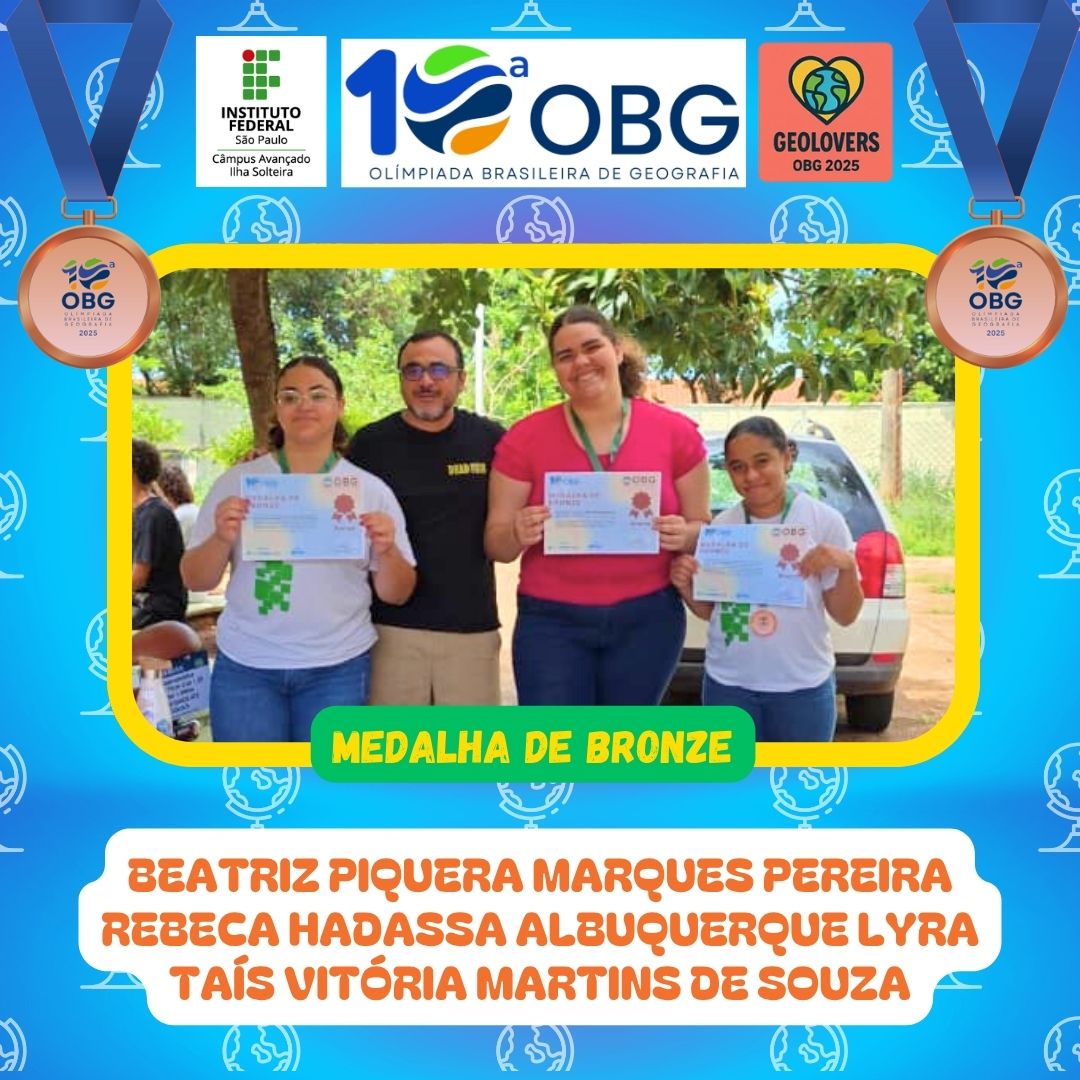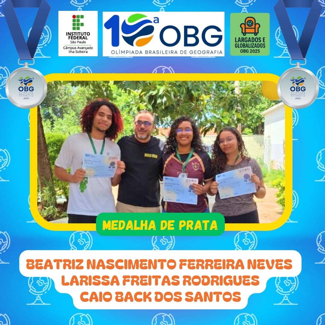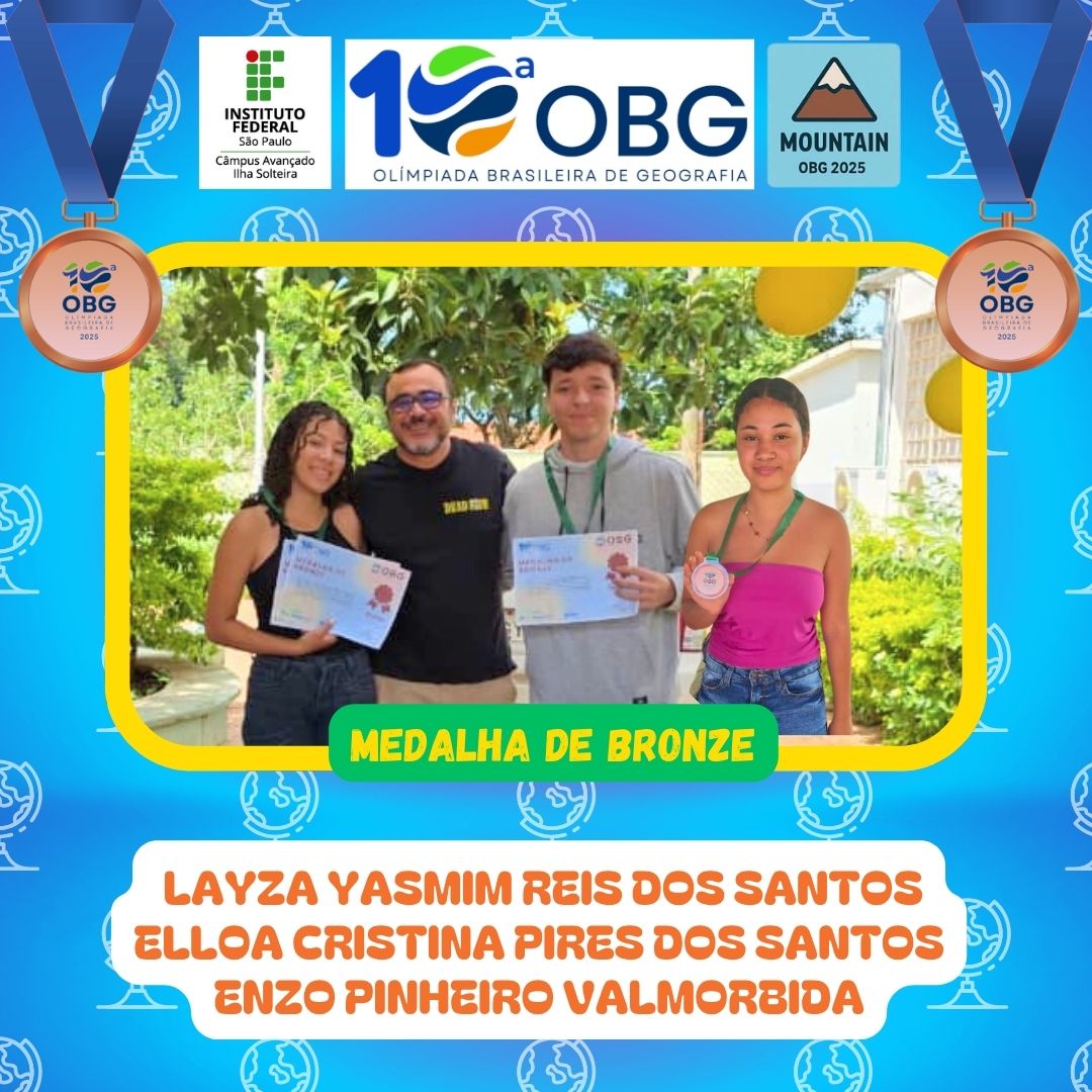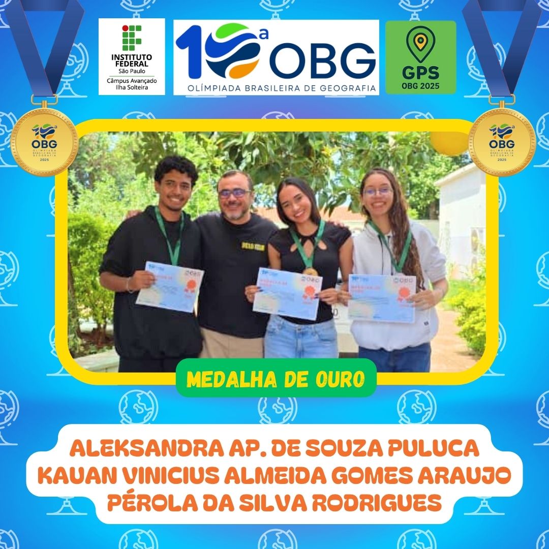 As/os discentes do IFSP Campus Ilha Solteira tiveram excelentes resultados na 10ª Olimpíada Brasileira de Geografia (OBG), realizada no mês de agosto. Um total de 30 alunos participaram da competição, divididos em 10 equipes. 9 delas foram contempladas com medalhas. Sendo 4 de ouro, 2 de prata e 3 de bronze.